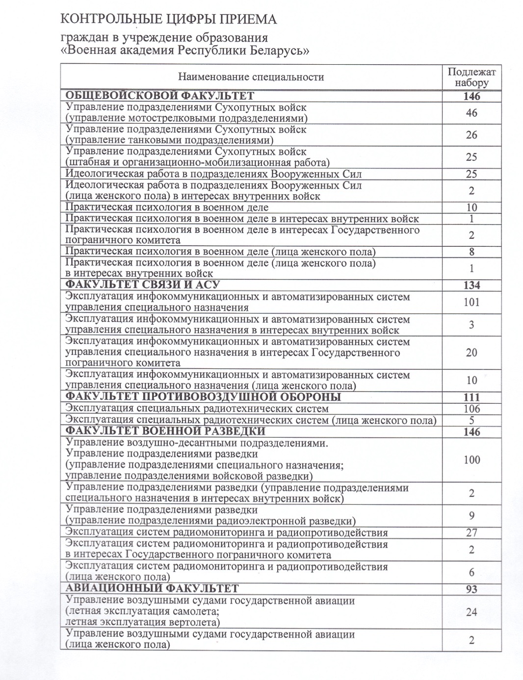 Контрольные цифры приема граждан в УО "Военная академия Республики Беларусь"